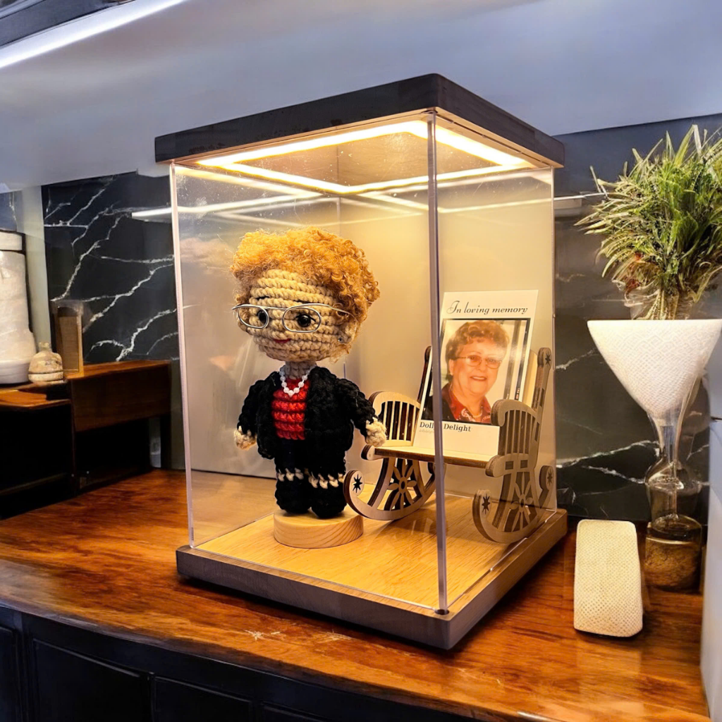 More than a keepsake — this beautifully illuminated set is a heartfelt way to honor and remember your loved ones. Each collection includes a personalized crochet doll, a symbolic rocking chair, and a custom photo card, all elegantly displayed inside a clear LED light box. Thoughtfully handcrafted, it’s a radiant tribute that keeps their memory shining and offers lasting comfort to those who cherish them.